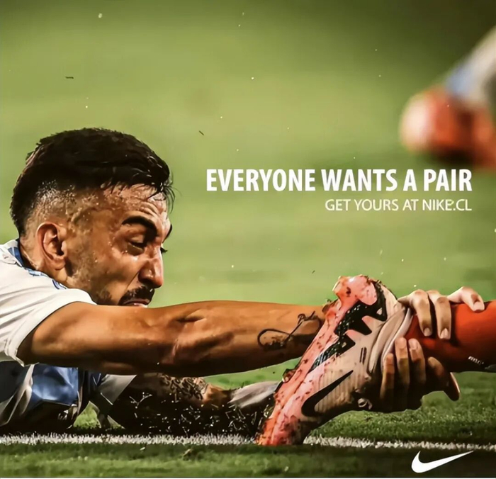 比如在美洲杯比赛中,阿根廷球员拉脚犯规,经耐克一加工,却成了宣传语“每个人都想要一双,去NIKE.CL给自己买一双吧”,轻松玩梗不伤人,画面瞬间变得有喜感起来。