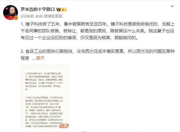 1月16日15:06分,罗永浩通过个人微博@罗永浩的十字路口发布针对这两日网络上掀起的关于“西贝将关闭102家门店”、“贾国龙坚称西贝门店不是预制菜”等热点话题的讨论。罗永浩称:锤子科技做了五年,集中被黑就有足足四年。锤子科技是被我做倒闭的,后期上千名同事的团队被裁、被转让,都是我的原因,跟被黑没什么关系。我这辈子也没有见过一个企业没犯别的错误,仅仅是因为被...